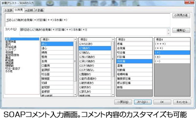 処置内容の登録と同時にSOAPコメントの入力画面も表示され、流れに沿って入力を行う事によって、より簡単に確実なカルテ作成が可能になります。治療計画機能では、最終補綴物を予め選択する事により、保険算定項目が自動的に候補に挙がります。また、新たに歯周治療のアシスト機能を搭載しました。SRP等の算定・未算定部位を判断し、部位登録の間違い等を未然に防ぐ事が可能になります。